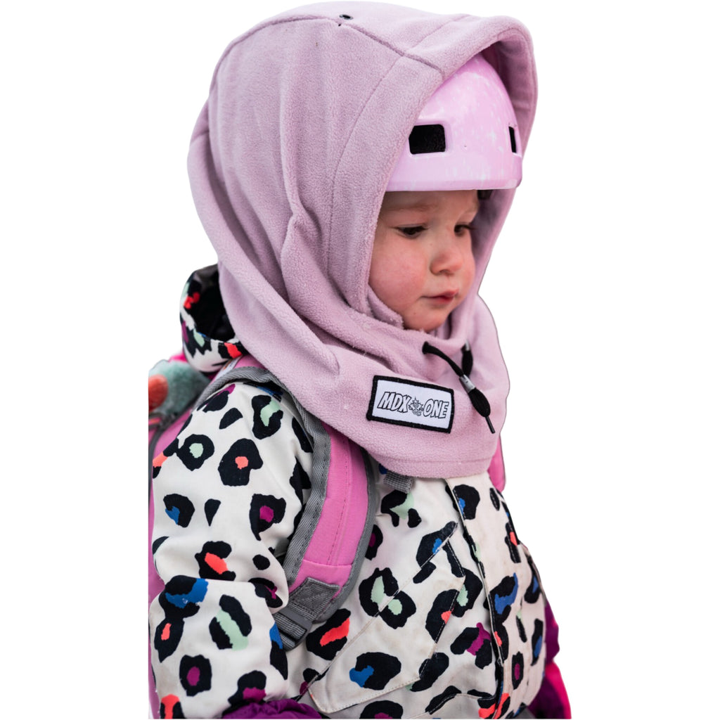 Cagoule en laine polaire sur le casque pour les enfants, conçue pour les jeux d'hiver et les journées de cours.