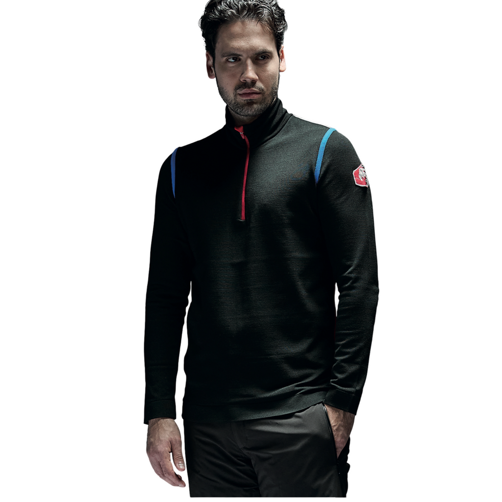 Fermeture éclair 1/2 à col en T thermique en DHtech 280, fin, doux et chaud, orné d'applications contrastées qui rappellent les jeux d'hiver. Le tissu garantit une grande respirabilité, et maintient une température corporelle constante. Un vêtement adapté à tous les sports pratiqués dans le froid. Respirant, isolant, antibactérien, hypoallergénique. Il comporte un patch de goût vintage.