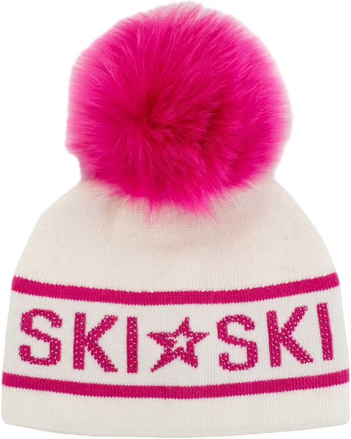 TUQUE "SKI" EN TRICOT AVEC CRYSTAUX ET POMPOM NOIR EN RENARD
